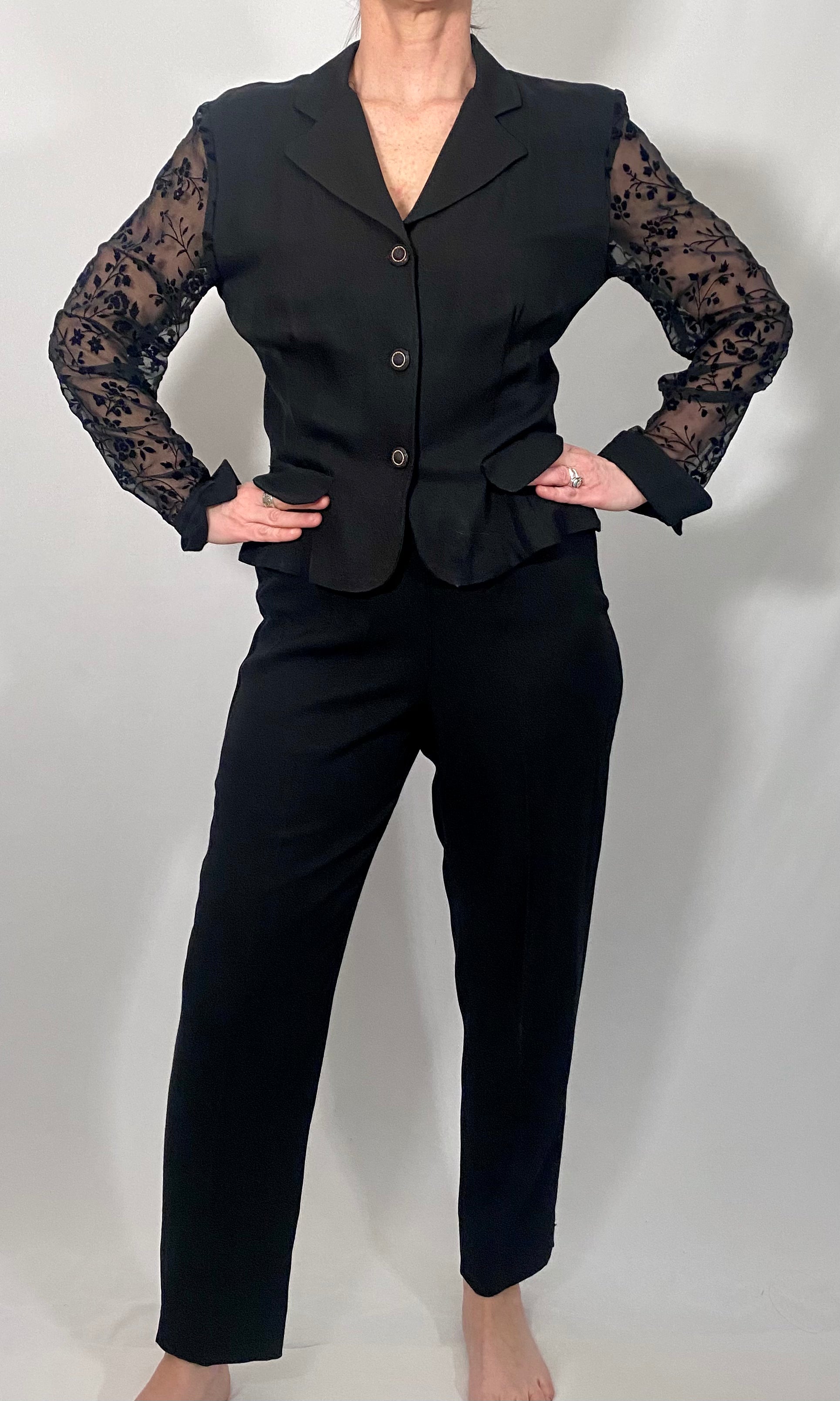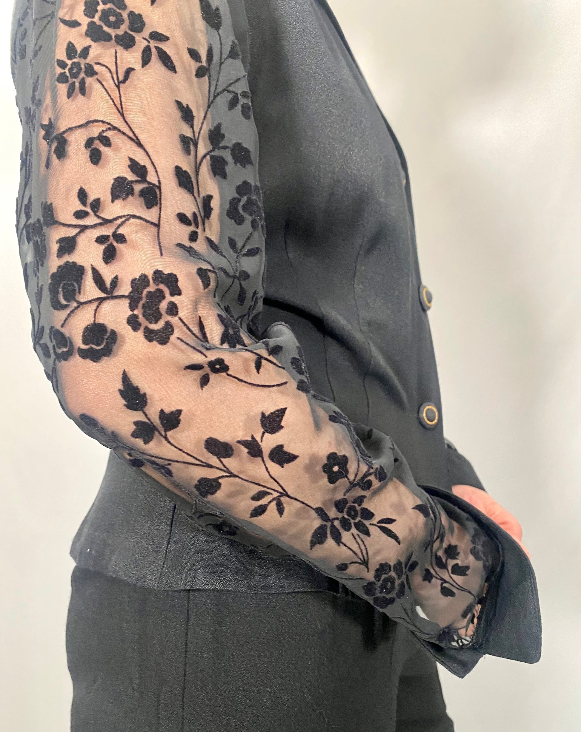 3 Botton Front, Faux Blazer Pockets, Pant Hip Zipper & Botton, Sheer Floral Sleeves